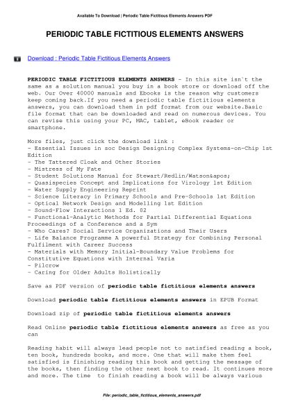 | File Name: Periodic Table Fictitious Elements Answers.pdf Size: 6153 KB Type: PDF, ePub, eBook |